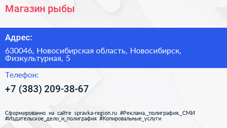 Магазин рыбы по адресу 630046, Новосибирская область, Новосибирск, Физкультурная, 5 в дальнейшем Организация, размещена в следующих категориях: