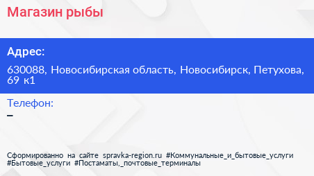 Магазин рыбы по адресу 630088, Новосибирская область, Новосибирск, Петухова, 69 к1 в дальнейшем Организация, размещена в следующих категориях: