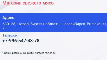 Магазин свежего мяса по адресу 630126, Новосибирская область, Новосибирск, Вилюйская, 5 в дальнейшем Организация, размещена в следующих категориях: