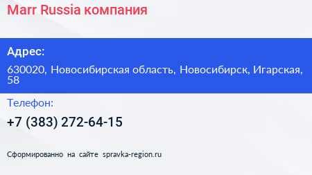 Marr Russia, компания по адресу 630020, Новосибирская область, Новосибирск, Игарская, 58 в дальнейшем Организация, размещена в следующих категориях: