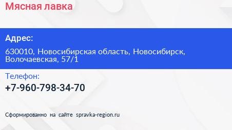 Мясная лавка по адресу 630010, Новосибирская область, Новосибирск, Волочаевская, 57/1 в дальнейшем Организация, размещена в следующих категориях: