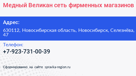Медный Великан, сеть фирменных магазинов по адресу 630112, Новосибирская область, Новосибирск, Селезнёва, 47 в дальнейшем Организация, размещена в следующих категориях: