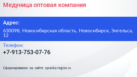 Медуница, оптовая компания по адресу 630098, Новосибирская область, Новосибирск, Энгельса, 12 в дальнейшем Организация, размещена в следующих категориях: