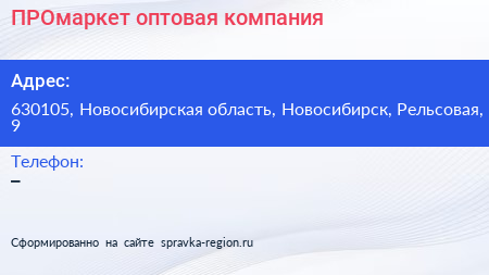 ПРОмаркет, оптовая компания по адресу 630105, Новосибирская область, Новосибирск, Рельсовая, 9 в дальнейшем Организация, размещена в следующих категориях: