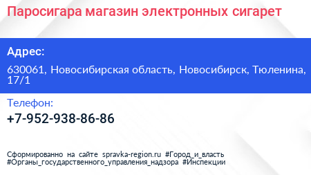 Паросигара, магазин электронных сигарет по адресу 630061, Новосибирская область, Новосибирск, Тюленина, 17/1 в дальнейшем Организация, размещена в следующих категориях: