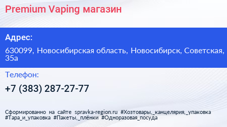 Premium Vaping, магазин по адресу 630099, Новосибирская область, Новосибирск, Советская, 35а в дальнейшем Организация, размещена в следующих категориях: