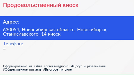 Продовольственный киоск по адресу 630054, Новосибирская область, Новосибирск, Станиславского, 14 киоск в дальнейшем Организация, размещена в следующих категориях: