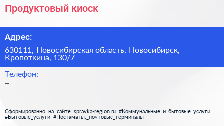Продуктовый киоск по адресу 630111, Новосибирская область, Новосибирск, Кропоткина, 130/7 в дальнейшем Организация, размещена в следующих категориях: