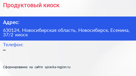 Продуктовый киоск по адресу 630124, Новосибирская область, Новосибирск, Есенина, 37/2 киоск в дальнейшем Организация, размещена в следующих категориях: