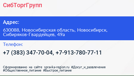 СибТоргГрупп по адресу 630088, Новосибирская область, Новосибирск, Сибиряков-Гвардейцев, 49а в дальнейшем Организация, размещена в следующих категориях: