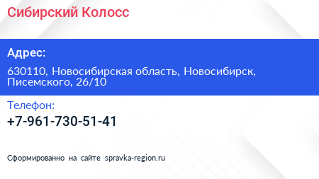 Сибирский Колосс по адресу 630110, Новосибирская область, Новосибирск, Писемского, 26/10 в дальнейшем Организация, размещена в следующих категориях: