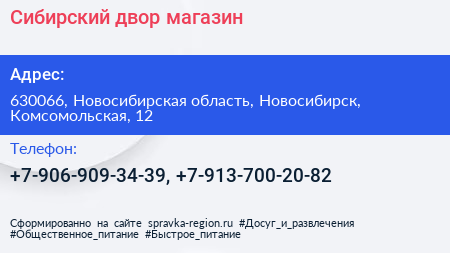 Сибирский двор, магазин по адресу 630066, Новосибирская область, Новосибирск, Комсомольская, 12 в дальнейшем Организация, размещена в следующих категориях: