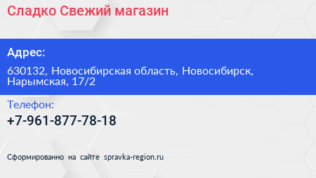 Сладко Свежий, магазин по адресу 630132, Новосибирская область, Новосибирск, Нарымская, 17/2 в дальнейшем Организация, размещена в следующих категориях: