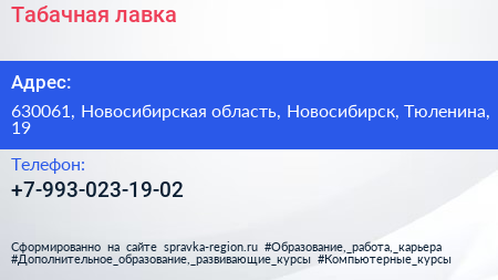 Табачная лавка по адресу 630061, Новосибирская область, Новосибирск, Тюленина, 19 в дальнейшем Организация, размещена в следующих категориях: