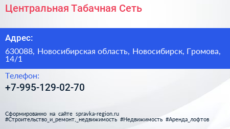 Центральная Табачная Сеть по адресу 630088, Новосибирская область, Новосибирск, Громова, 14/1 в дальнейшем Организация, размещена в следующих категориях: