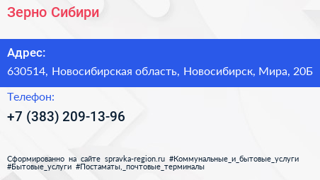 Зерно Сибири по адресу 630514, Новосибирская область, Новосибирск, Мира, 20Б в дальнейшем Организация, размещена в следующих категориях: