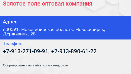 Золотое поле, оптовая компания по адресу 630091, Новосибирская область, Новосибирск, Державина, 28 в дальнейшем Организация, размещена в следующих категориях: