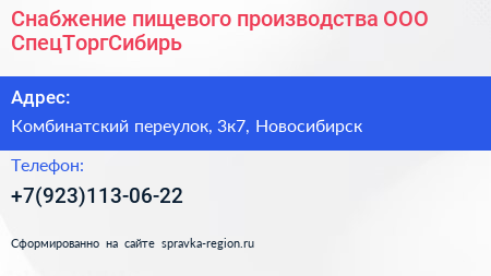 Снабжение пищевого производства ООО "СпецТоргСибирь" по адресу Комбинатский переулок, 3к7, Новосибирск в дальнейшем Организация, размещена в следующих категориях: