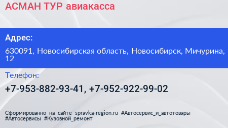 АСМАН ТУР, авиакасса по адресу 630091, Новосибирская область, Новосибирск, Мичурина, 12 в дальнейшем Организация, размещена в следующих категориях: