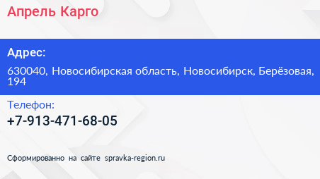 Апрель Карго по адресу 630040, Новосибирская область, Новосибирск, Берёзовая, 194 в дальнейшем Организация, размещена в следующих категориях: