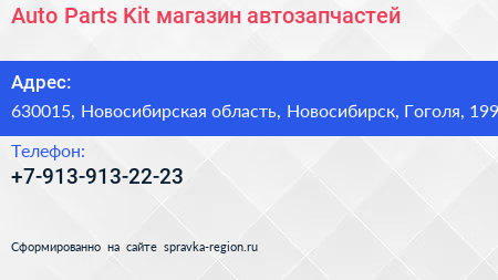Auto Parts Kit, магазин автозапчастей по адресу 630015, Новосибирская область, Новосибирск, Гоголя, 199 в дальнейшем Организация, размещена в следующих категориях: