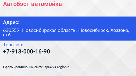 Автобэст, автомойка по адресу 630559, Новосибирская область, Новосибирск, Хоззона, ст6 в дальнейшем Организация, размещена в следующих категориях: