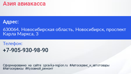 Азия, авиакасса по адресу 630064, Новосибирская область, Новосибирск, проспект Карла Маркса, 3 в дальнейшем Организация, размещена в следующих категориях: