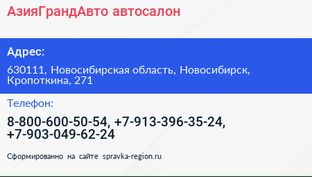 АзияГрандАвто, автосалон по адресу 630111, Новосибирская область, Новосибирск, Кропоткина, 271 в дальнейшем Организация, размещена в следующих категориях: