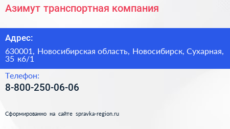 Азимут, транспортная компания по адресу 630001, Новосибирская область, Новосибирск, Сухарная, 35 к6/1 в дальнейшем Организация, размещена в следующих категориях: