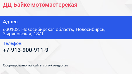 ДД Байкс, мотомастерская по адресу 630102, Новосибирская область, Новосибирск, Зыряновская, 18/1 в дальнейшем Организация, размещена в следующих категориях: