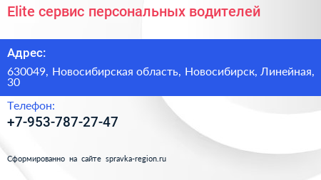 Elite, сервис персональных водителей по адресу 630049, Новосибирская область, Новосибирск, Линейная, 30 в дальнейшем Организация, размещена в следующих категориях: