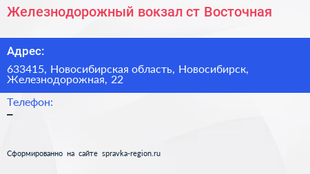 Железнодорожный вокзал, ст. Восточная по адресу 633415, Новосибирская область, Новосибирск, Железнодорожная, 22 в дальнейшем Организация, размещена в следующих категориях: