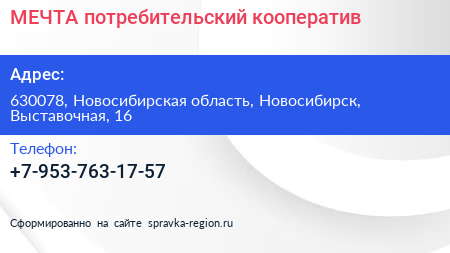 МЕЧТА, потребительский кооператив по адресу 630078, Новосибирская область, Новосибирск, Выставочная, 16 в дальнейшем Организация, размещена в следующих категориях: