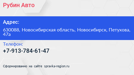 Рубин Авто по адресу 630088, Новосибирская область, Новосибирск, Петухова, 47а в дальнейшем Организация, размещена в следующих категориях: