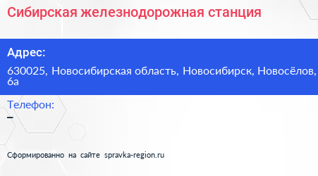 Сибирская, железнодорожная станция по адресу 630025, Новосибирская область, Новосибирск, Новосёлов, 6а в дальнейшем Организация, размещена в следующих категориях: