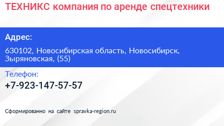ТЕХНИКС, компания по аренде спецтехники по адресу 630102, Новосибирская область, Новосибирск, Зыряновская, (55) в дальнейшем Организация, размещена в следующих категориях:
