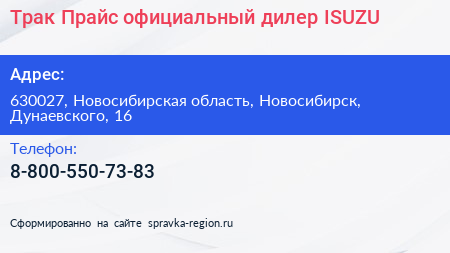 Трак-Прайс, официальный дилер ISUZU по адресу 630027, Новосибирская область, Новосибирск, Дунаевского, 16 в дальнейшем Организация, размещена в следующих категориях: