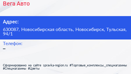 Вега-Авто по адресу 630087, Новосибирская область, Новосибирск, Тульская, 94/1 в дальнейшем Организация, размещена в следующих категориях:
