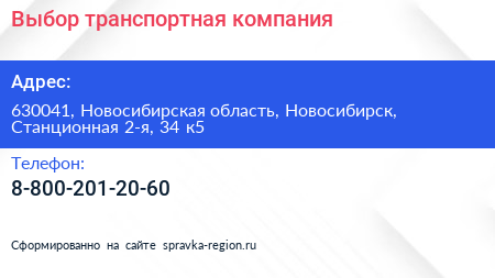 Выбор, транспортная компания по адресу 630041, Новосибирская область, Новосибирск, Станционная 2-я, 34 к5 в дальнейшем Организация, размещена в следующих категориях: