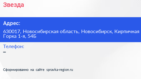 Звезда по адресу 630017, Новосибирская область, Новосибирск, Кирпичная Горка 1-я, 54Б в дальнейшем Организация, размещена в следующих категориях: