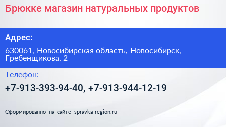 Брюкке, магазин натуральных продуктов по адресу 630061, Новосибирская область, Новосибирск, Гребенщикова, 2 в дальнейшем Организация, размещена в следующих категориях: