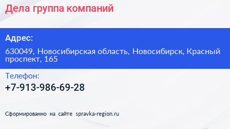 Дела, группа компаний по адресу 630049, Новосибирская область, Новосибирск, Красный проспект, 165 в дальнейшем Организация, размещена в следующих категориях: