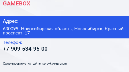 GAMEBOX по адресу 630099, Новосибирская область, Новосибирск, Красный проспект, 17 в дальнейшем Организация, размещена в следующих категориях: