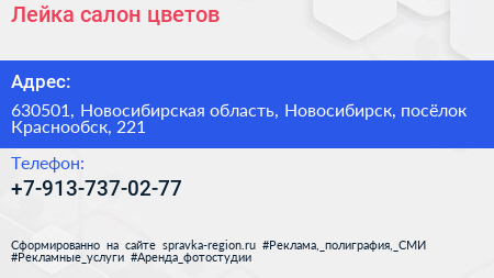 Лейка, салон цветов по адресу 630501, Новосибирская область, Новосибирск, посёлок Краснообск, 221 в дальнейшем Организация, размещена в следующих категориях: