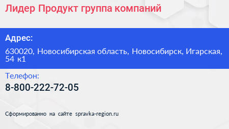 Лидер-Продукт, группа компаний по адресу 630020, Новосибирская область, Новосибирск, Игарская, 54 к1 в дальнейшем Организация, размещена в следующих категориях:
