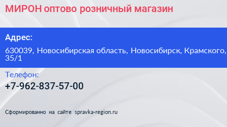 МИРОН, оптово-розничный магазин по адресу 630039, Новосибирская область, Новосибирск, Крамского, 35/1 в дальнейшем Организация, размещена в следующих категориях: