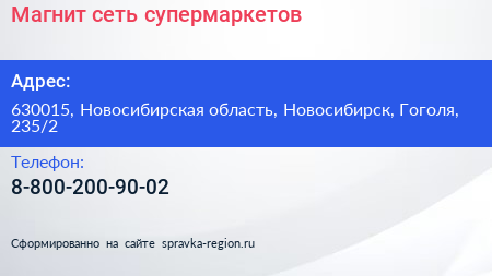 Магнит, сеть супермаркетов по адресу 630015, Новосибирская область, Новосибирск, Гоголя, 235/2 в дальнейшем Организация, размещена в следующих категориях: