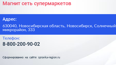 Магнит, сеть супермаркетов по адресу 630040, Новосибирская область, Новосибирск, Солнечный микрорайон, 333 в дальнейшем Организация, размещена в следующих категориях: