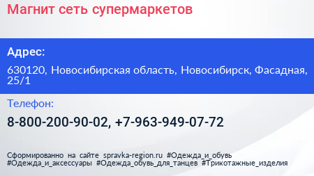 Магнит, сеть супермаркетов по адресу 630120, Новосибирская область, Новосибирск, Фасадная, 25/1 в дальнейшем Организация, размещена в следующих категориях:
