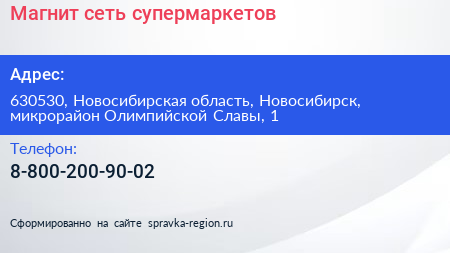 Магнит, сеть супермаркетов по адресу 630530, Новосибирская область, Новосибирск, микрорайон Олимпийской Славы, 1 в дальнейшем Организация, размещена в следующих категориях: